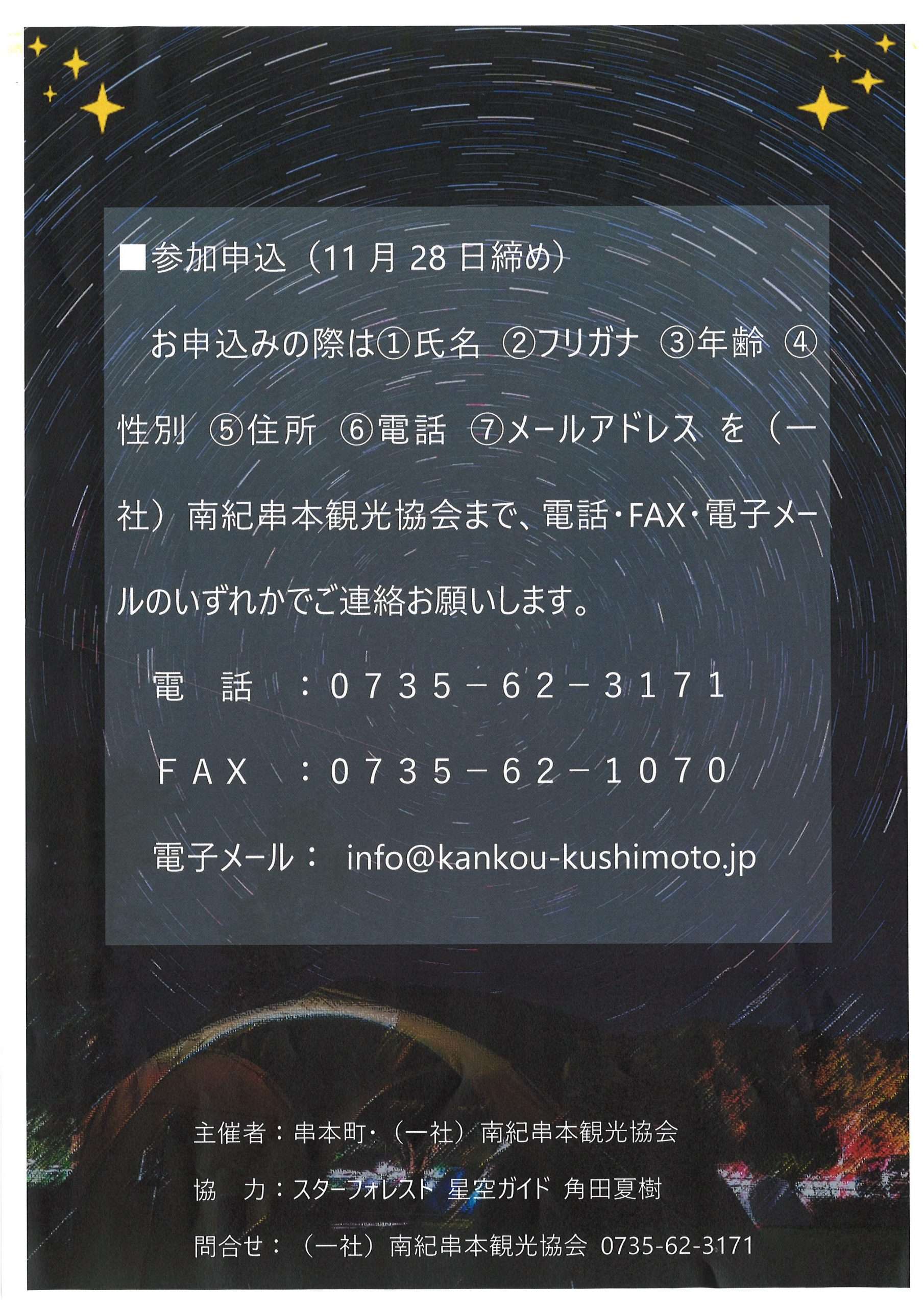 星がきれいに見える季節がやってきました。本州最南端の串本は人工の光が少なく星空を見るのに最適な場所です。今回初めての企画ですが、星の案内人をお招きして、星座観察会と撮影会を開催致します。今回は串本町と共催で、当日撮影した写真のコンテストも合わせて行います。ただし、今回の募集は「串本町在住者」に限定させて頂いております。好評であれば、町外の方を対象にした観察会&撮影会を今後実施していきたいと考えておりますので、何卒ご了解の程お願い申し上げます。