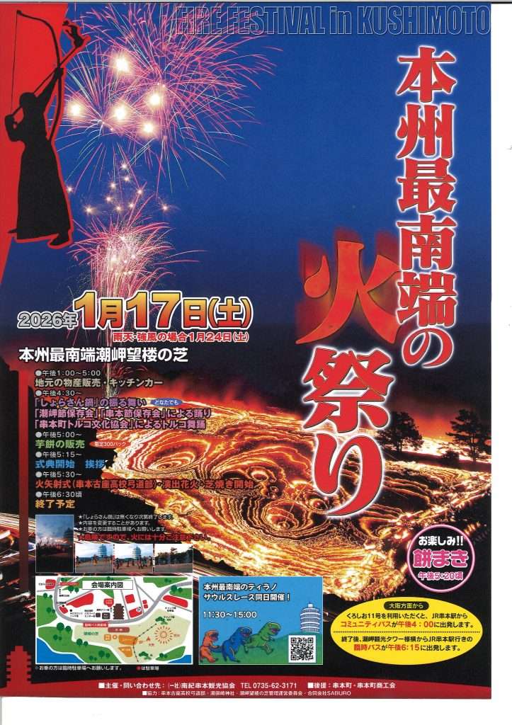 南紀串本に春を呼ぶ「本州最南端の火祭り」。太平洋を見下ろす広大な芝生に火を放ち、赤い炎が芝生全体を照らし出す幻想的な風景が見られます。当日は、串本古座高校弓道部による火矢に始まり、「しょらさん鍋のふるまい」や串本節、潮岬節、トルコ民族舞踊などの踊り、恒例の「餅まき」等が行われます。
